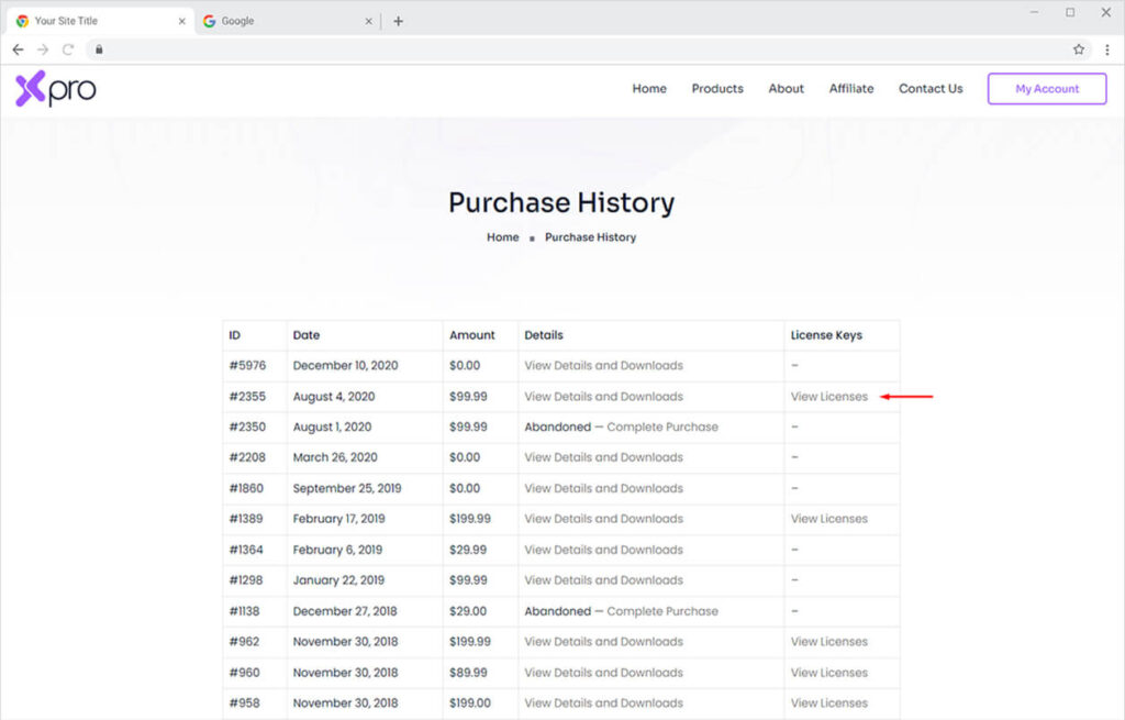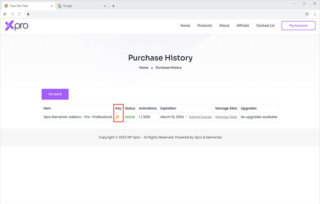 Go to your Xpro Account Dashboard, and open the ‘Purchase History’ section.