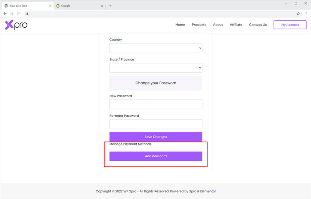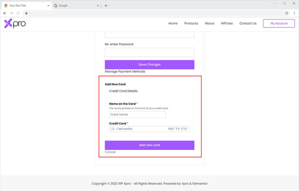 Add your valid credit card information and click on the ‘Add new card’ button to save changes.