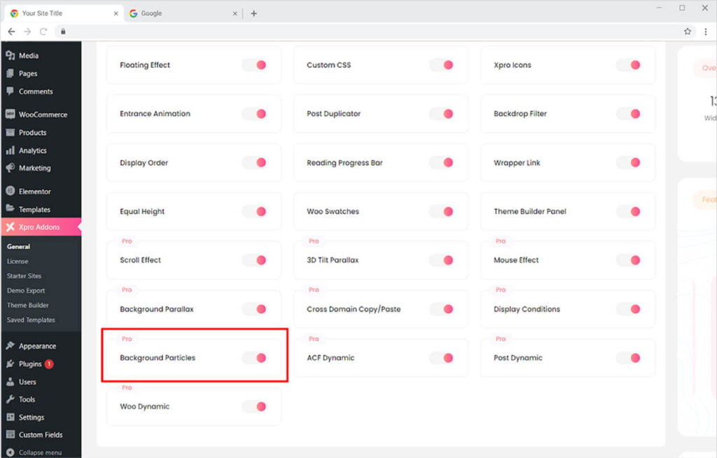 You need to install and activate the Pro version of Xpro Elementor Addons to use our Background Particles for your WordPress websites. Once the plugin is installed, just make sure the Xpro Background Particle is ‘Enabled’ from the Extensions tab of the Xpro Dashboard. This way you will easily find & use the effect in the Elementor editor.