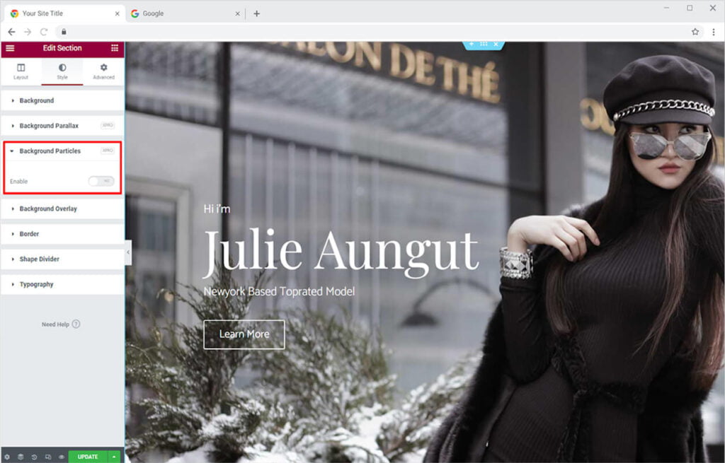 First, you need to select the section where you want to implement this feature. Go to the Style Section and search for the Background Particle menu and enable the feature.