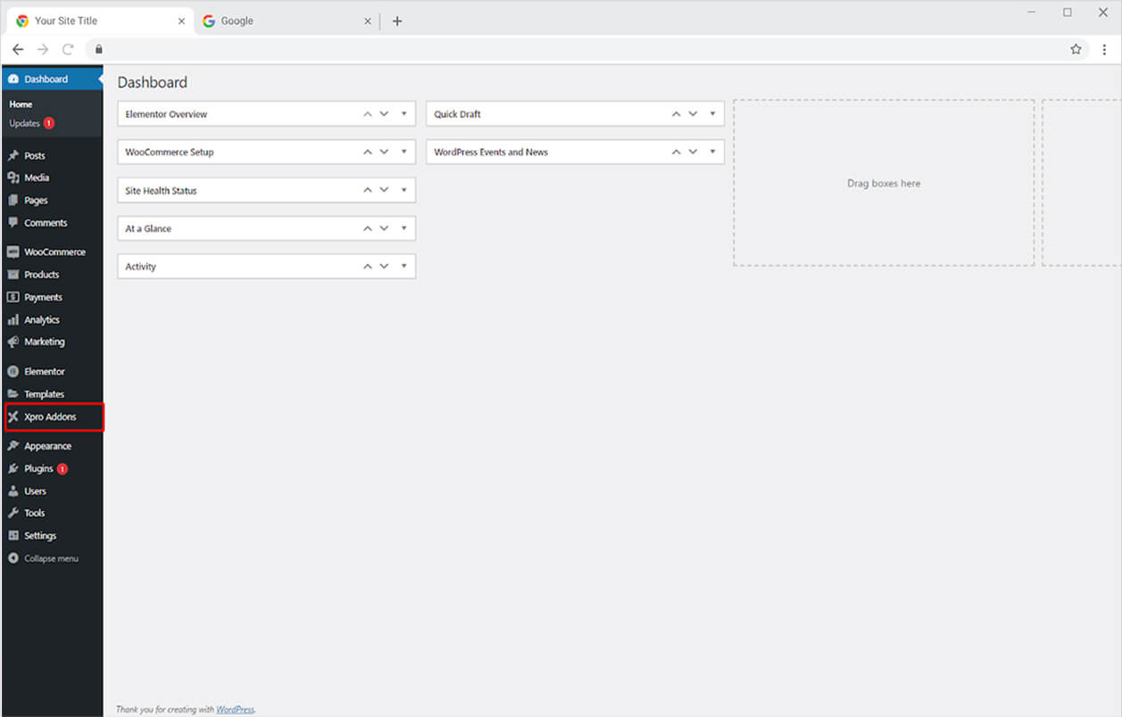 Click on the Xpro Addons option available on the WordPress Dashboard Menu.
