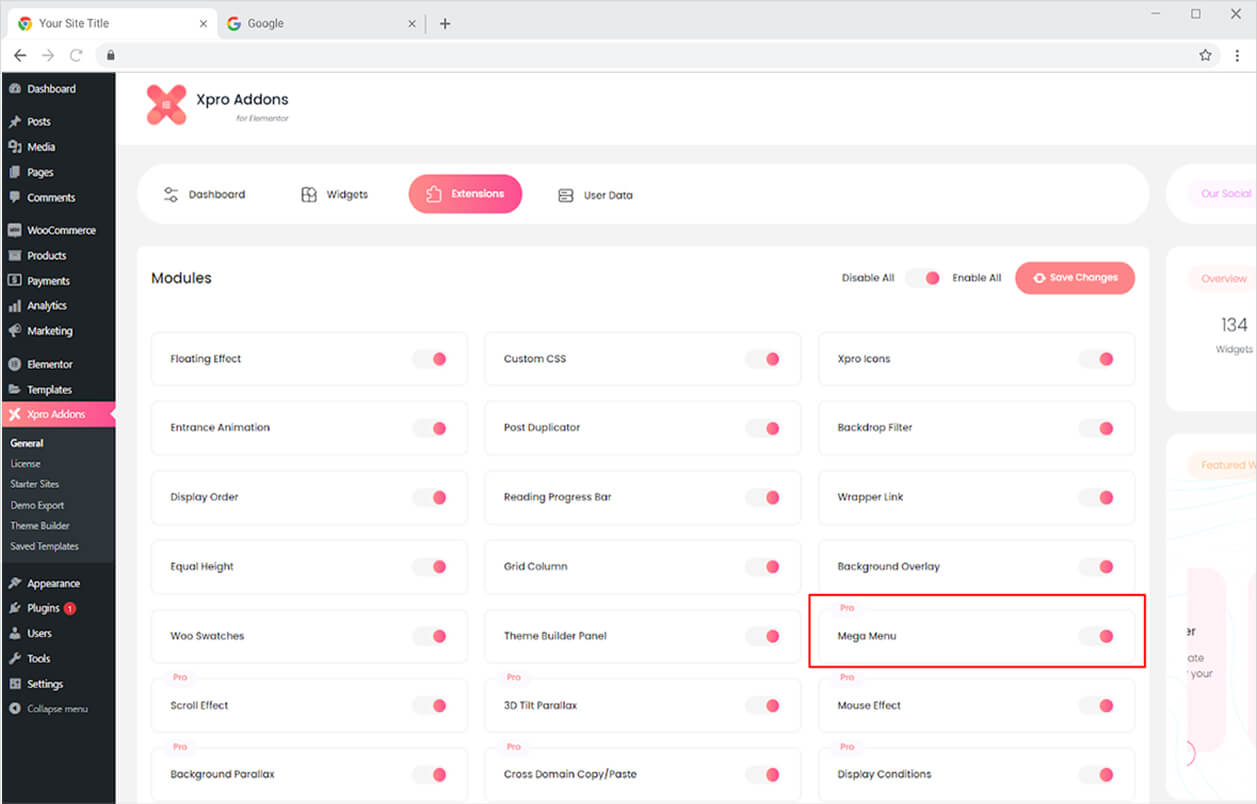From the Xpro Addons Dashboard, click on the Extension Tab, find the Mega Menu widget, and finally, toggle the button to enable it.