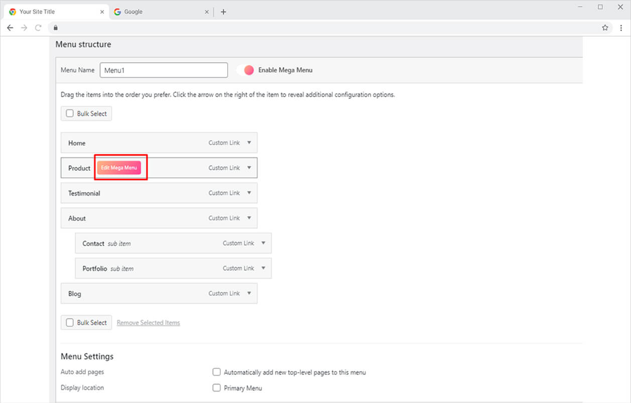 Hover over the menu where you want to add a mega menu and click on Edit Mega Menu.
