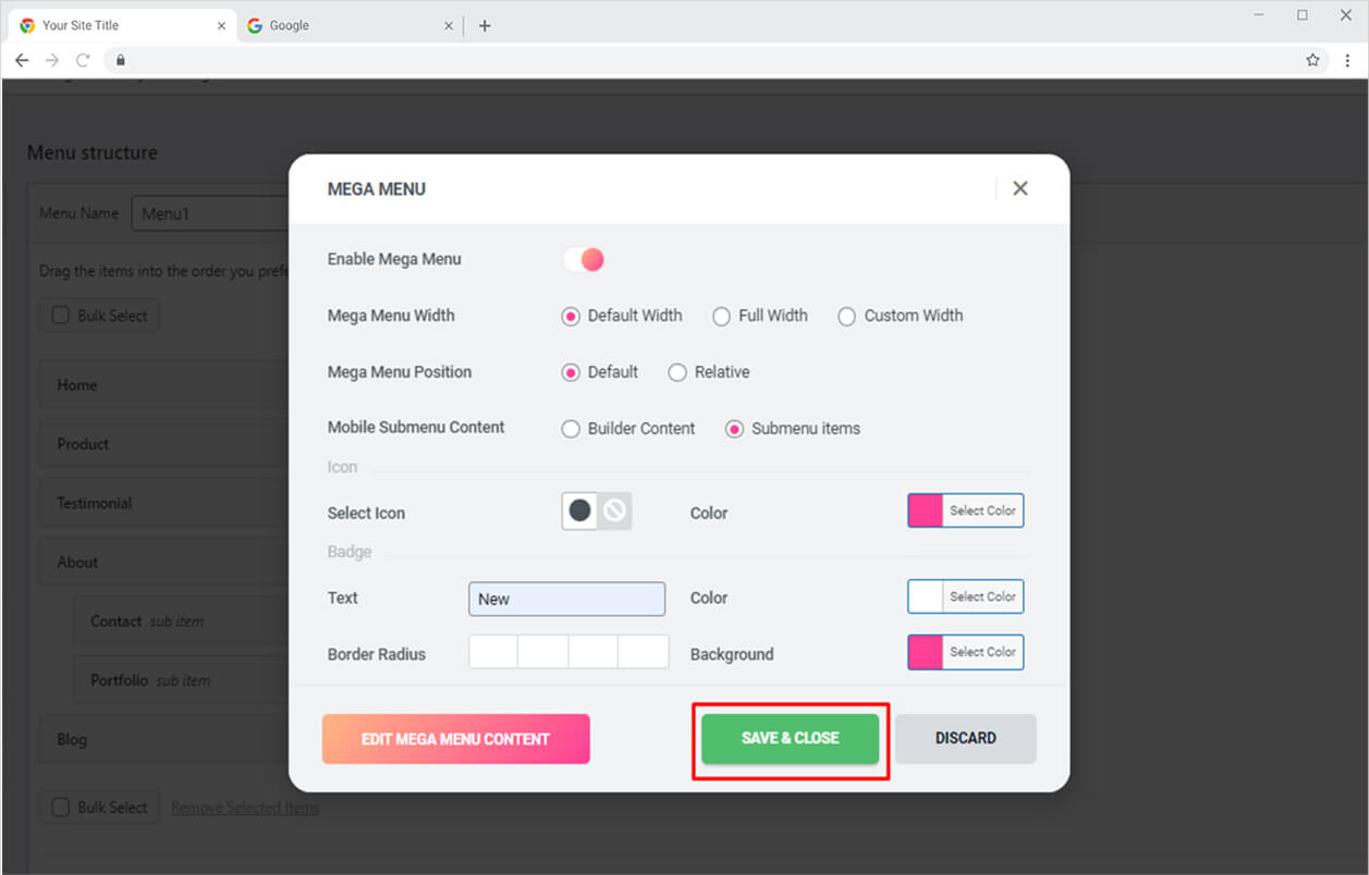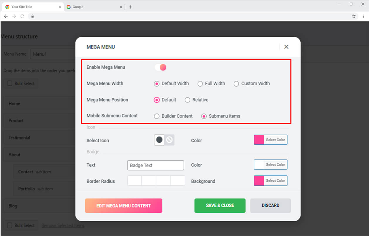 If you want to display an icon along with the menu then choose an icon and color it according to your requirement. Add a badge if you want by typing in the text that will display above the menu. You can further add color for text and background and adjust the border radius.