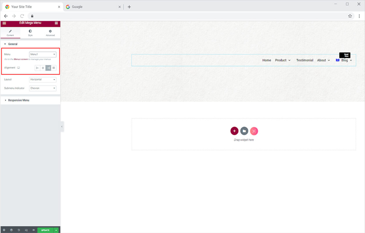 If you have created more than one menu then choose the menu that you want to be displayed in the Elementor Pagebuilder. Moreover, you have the option to align the menu to left, right, center, or justified.