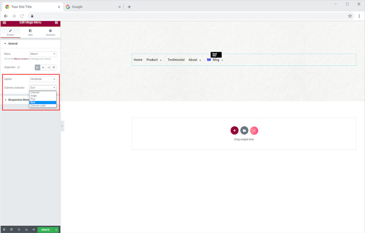 Style the layout in a horizontal and vertical way. From the Submenu Indicator, you can change the submenu arrow style.