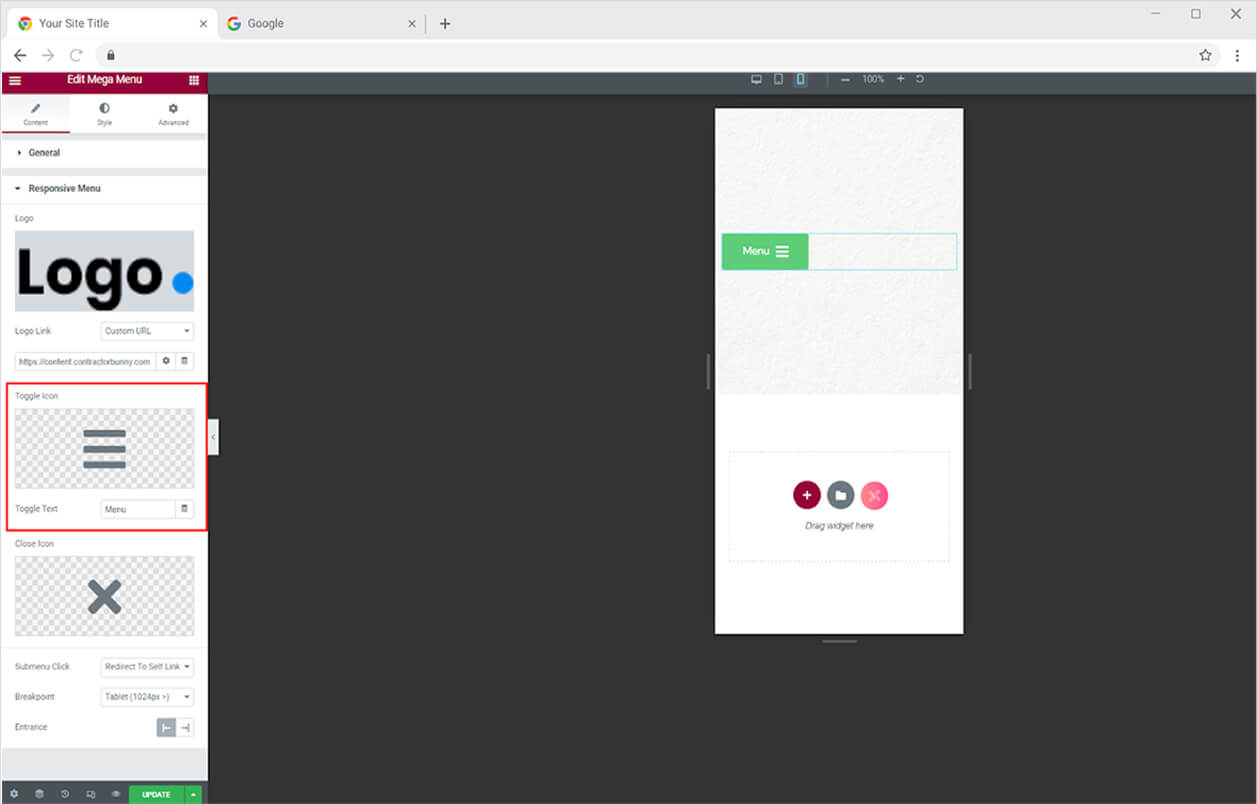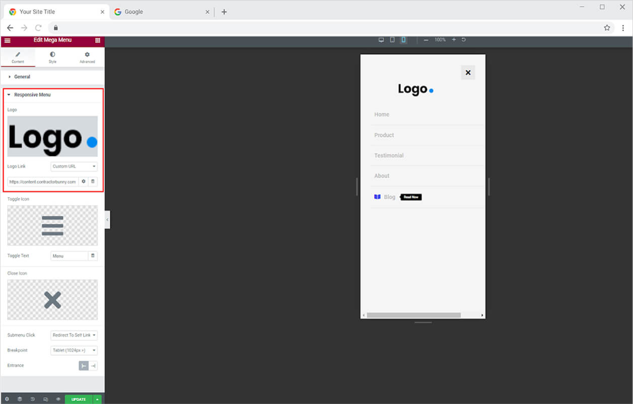Click and open the Responsive Mode menu to style the website menu for mobile view. Here you have the option to add a logo above the menu and give it a link.