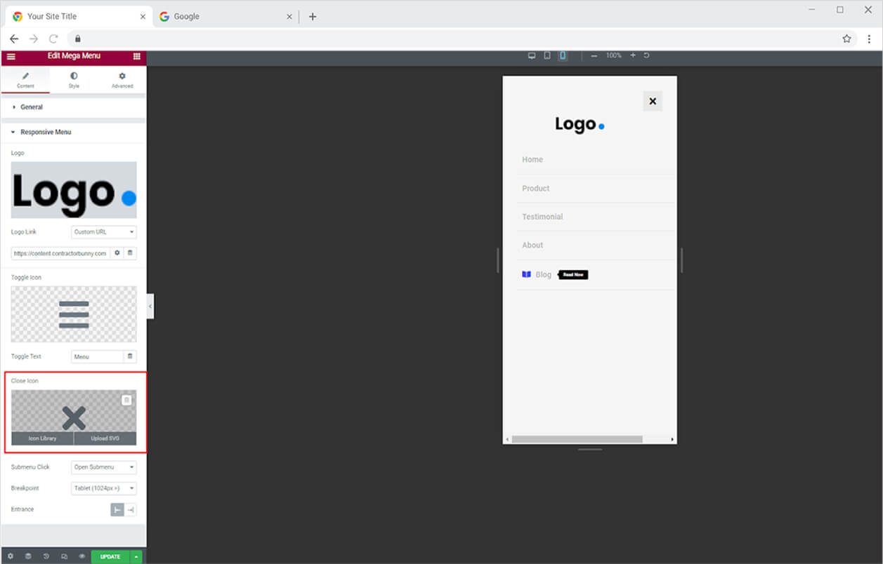 Select the action after the user clicks on the submenu; Open Submenu or Redirect to Self Link. The select breakpoint for tablet or mobile. In addition, select the entrance for the menu from right to left or left to right.