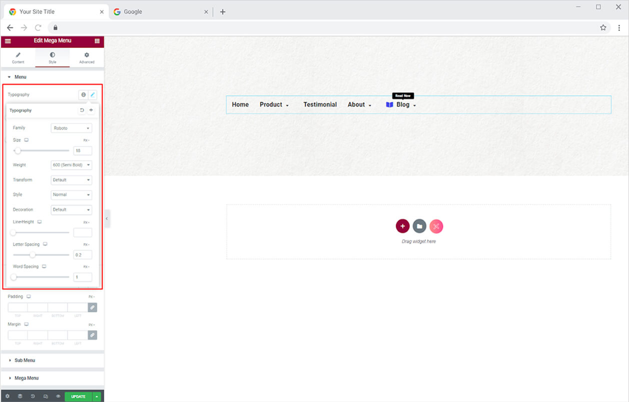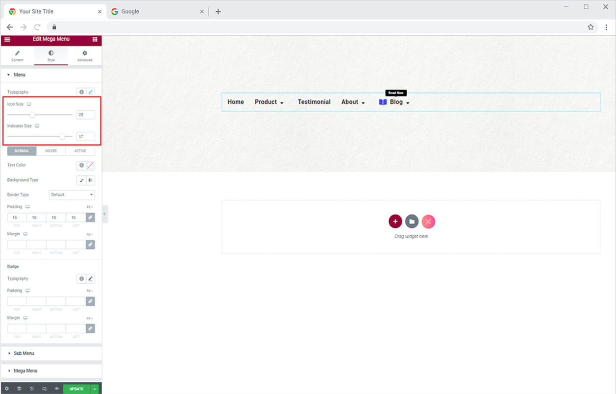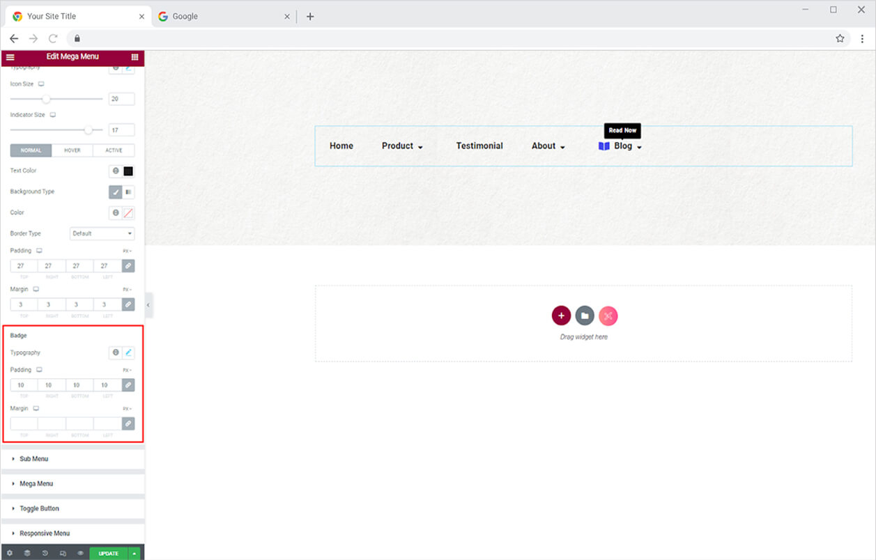 If you have added a badge to a menu, you can customize it as well. Style the text’s typography and adjust its padding and margin.