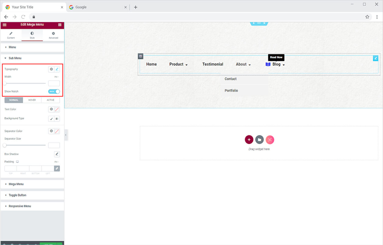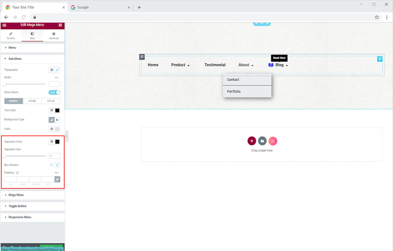 Just like the Menu, style the sub menu by adding color to the text, background, and separator for its normal, hover, and active.