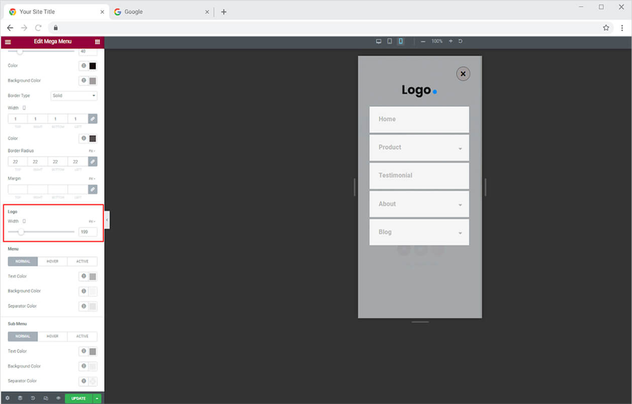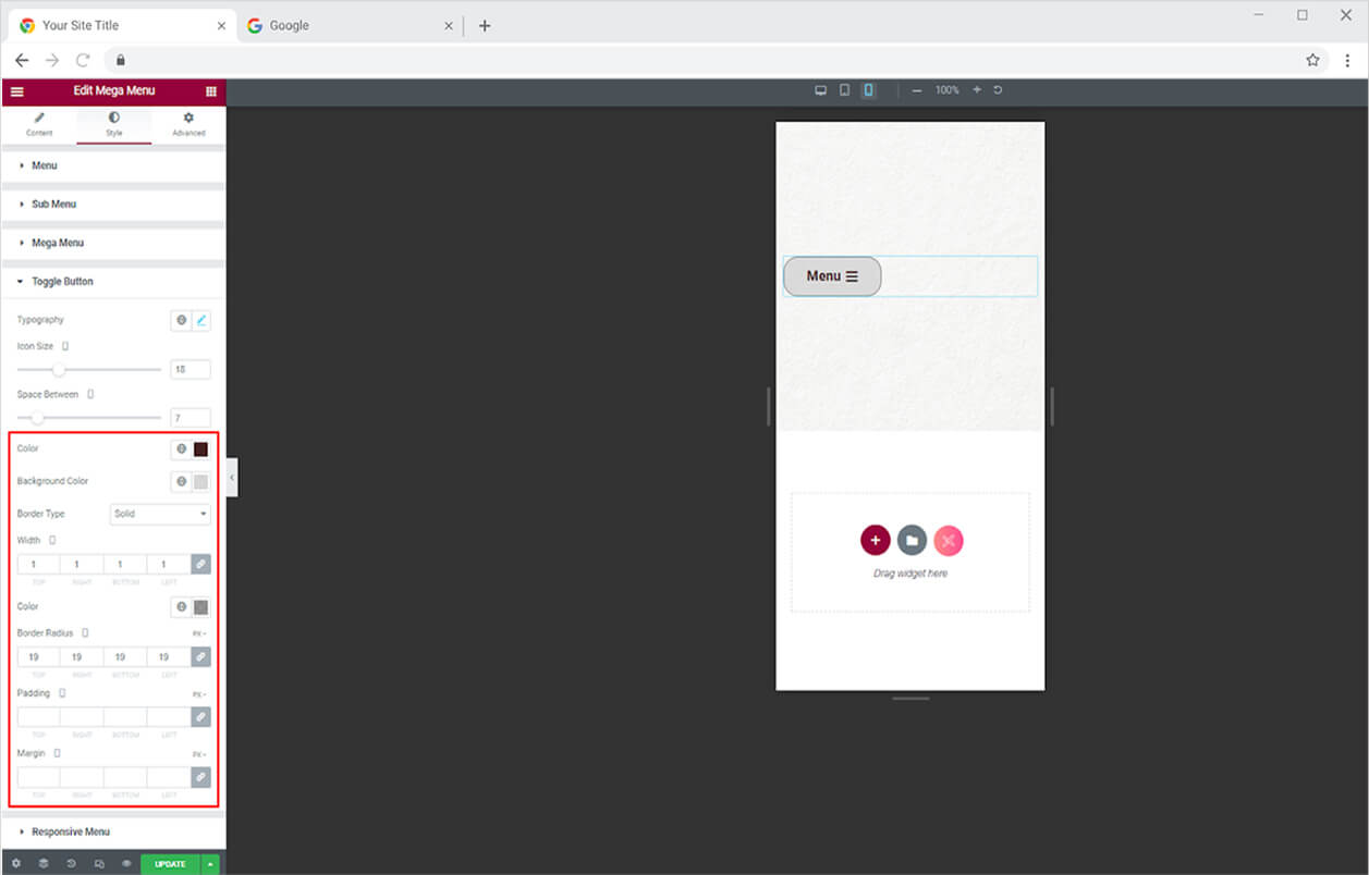 Color the menu’s text and background in the normal, hover, and active states. Furthermore, you may create a border by selecting one of the five border styles available, which allows you to control the width, radius, and color. Adjust the menu’s placement using the margin and padding parameters.