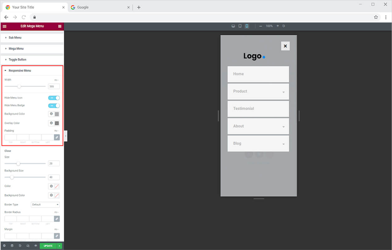 For responsive mode, adjust the menu width. In the responsive mode menu, you can choose to hide the badge and icon. Add a background color for the menu and overlay color.