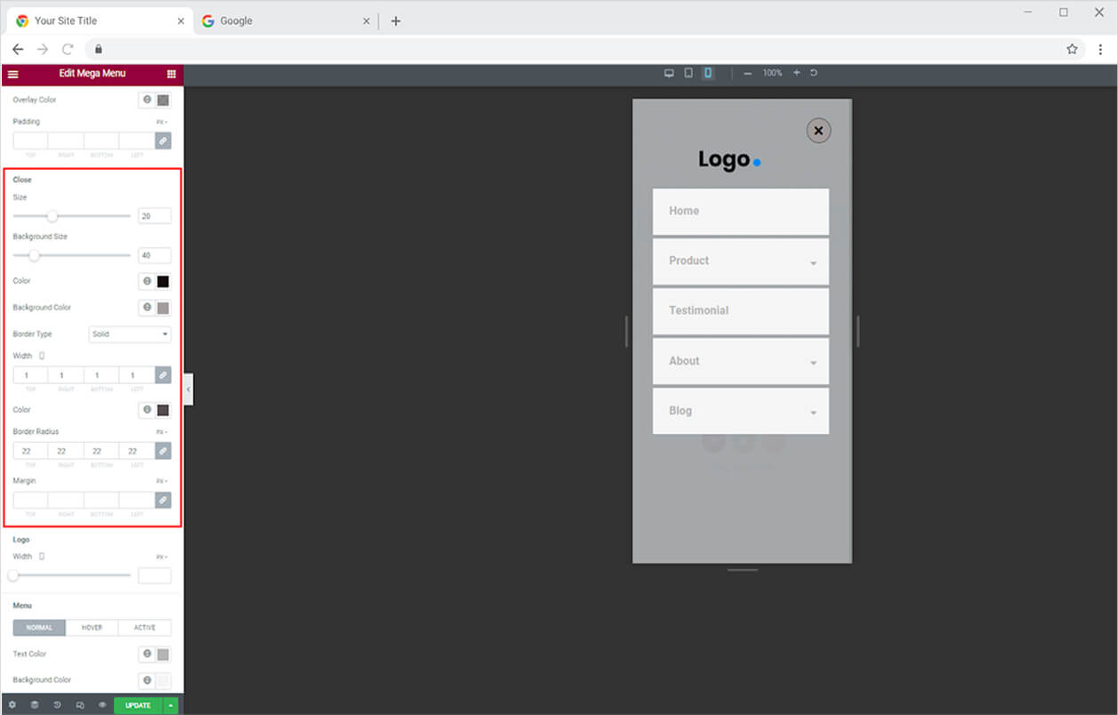 Adjust the size and color of the icon and background for the close button. You have the choice to add a border to the background and customize its width, radius, and color.