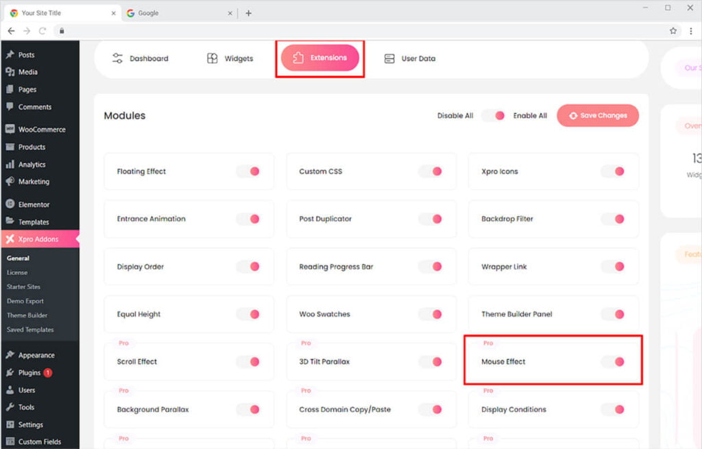 You need to install and activate the Pro version of Xpro Elementor Addons to use our Mouse Effect for your WordPress websites. Once the plugin is installed, just make sure Xpro Mouse Effect is ‘Enabled’ from the Extensions tab of the Xpro Dashboard. This way you will easily find & use the effect in the Elementor editor.