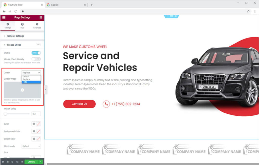 You have the option to change the cursor that will be displayed on the website. Add a mouse icon by selecting the option of replace from the cursor option. You can also hide the cursor or use the default.