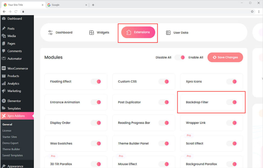 You need to install and activate the Free version of Xpro Elementor Addons to use our Backdrop Filter Feature for your WordPress websites. Once the plugin is installed, just make sure the Backdrop Filter is ‘Enabled’ from the Extensions tab of the Xpro Dashboard. This way you will easily find & use the effect in the Elementor editor.