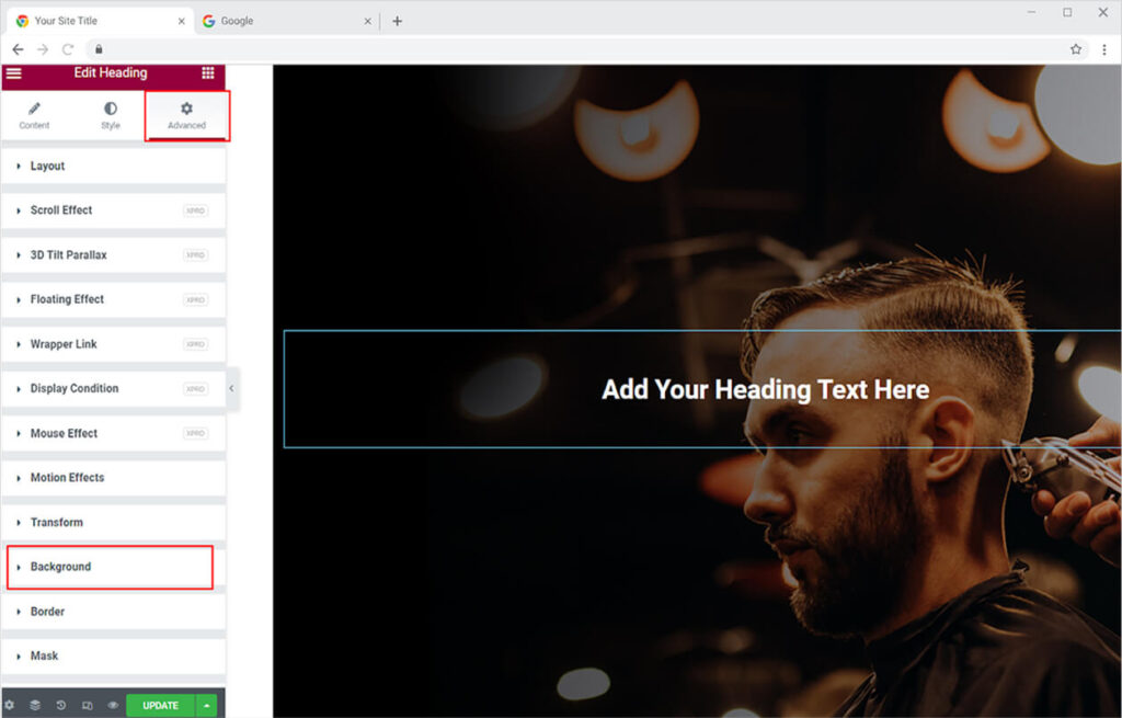 After you select the part where you want to add the feature, click on the Advanced Tab in the Elementor page builder and open the background section.