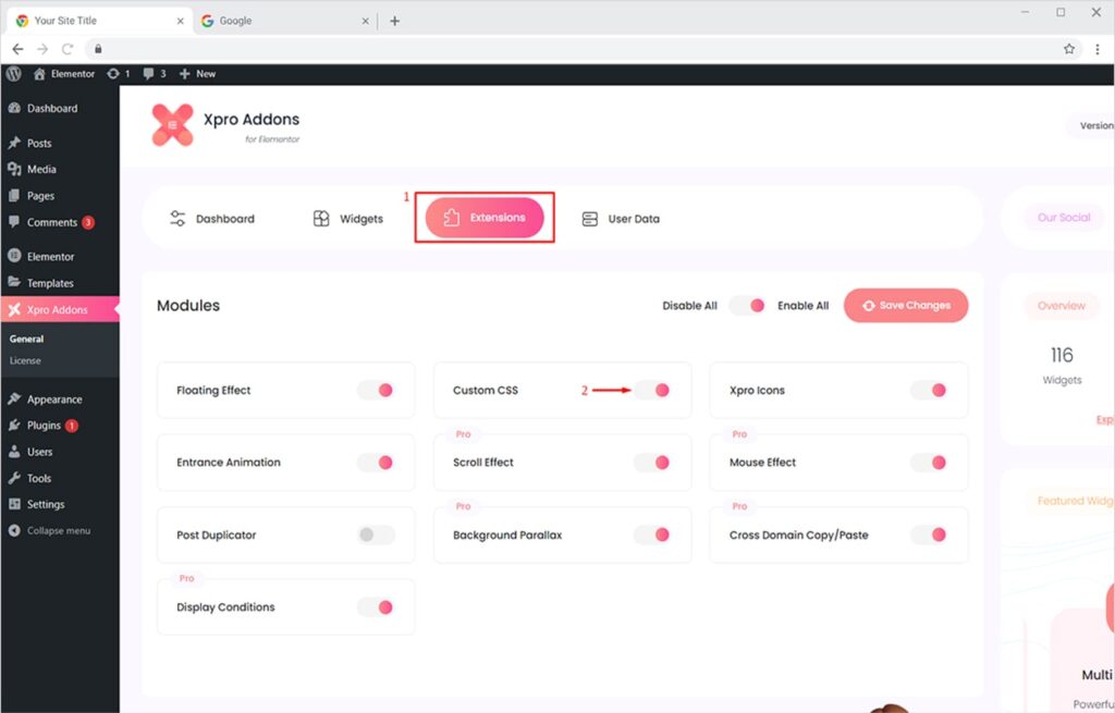 From the Dashboard, click on the Extensions Tab, find the Custom CSS option, and then toggle the button ‘ON’ to enable it.