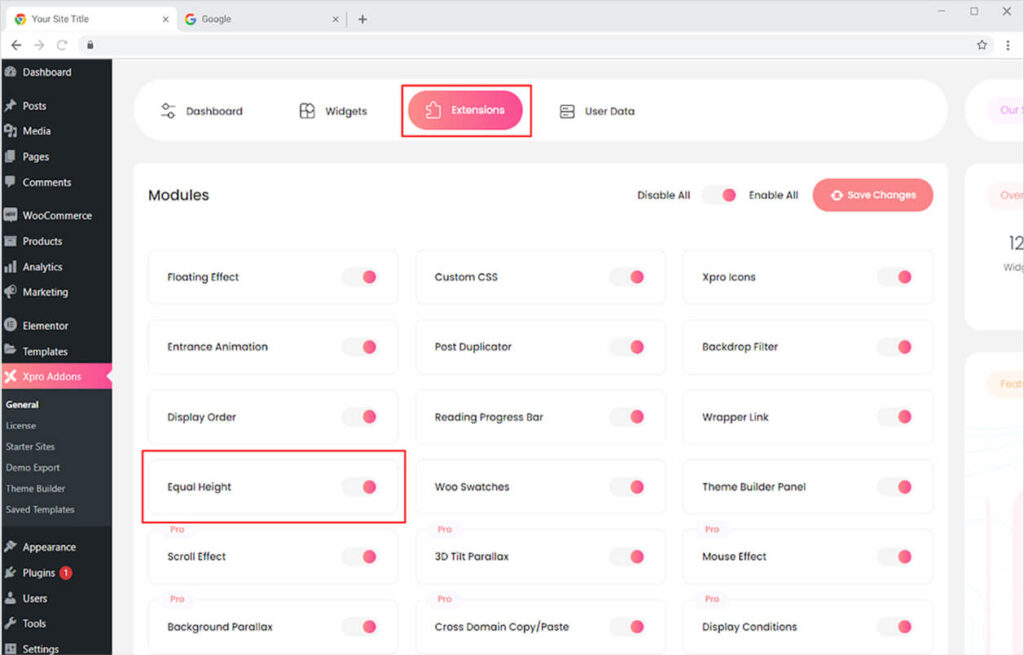 You need to install and activate the Free version of Xpro Elementor Addons to use our Equal Height for your WordPress websites. Once the plugin is installed, just make sure Equal Height is ‘Enabled’ from the Extensions tab of the Xpro Dashboard. This way you will easily find & use the effect in the Elementor editor.