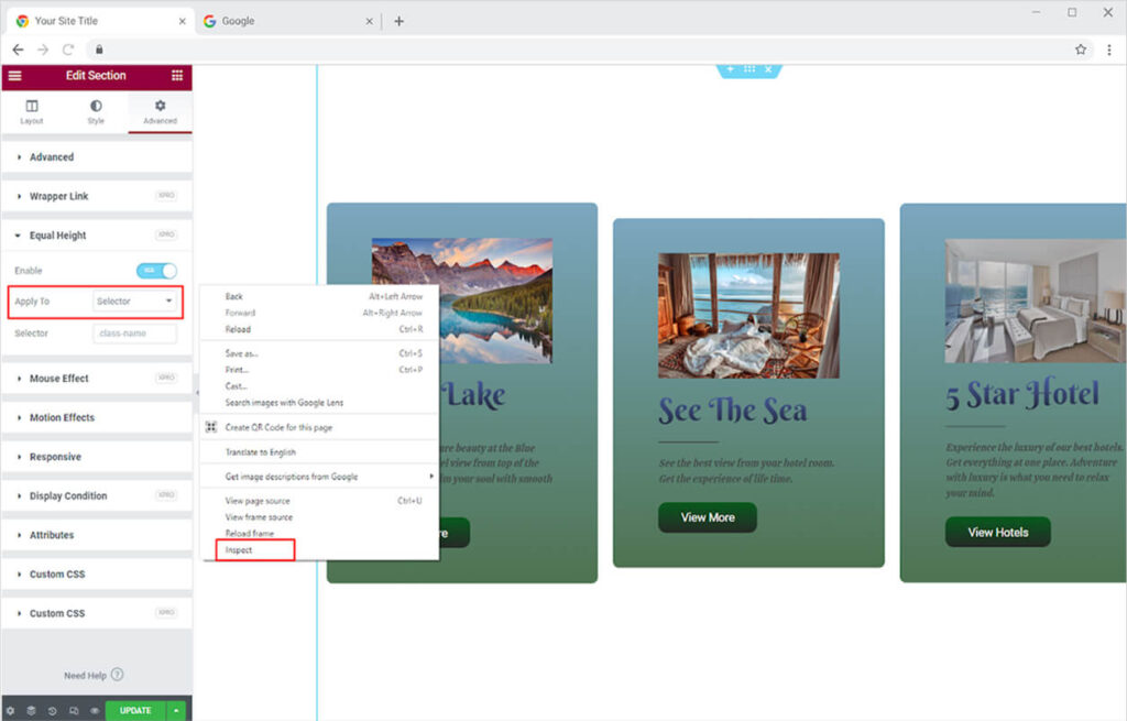 In order to apply Equal Height from the CSS selector option, chose the option of the selector from Apply To drag-down menu. Right-click anywhere on the screen and open the inspect.