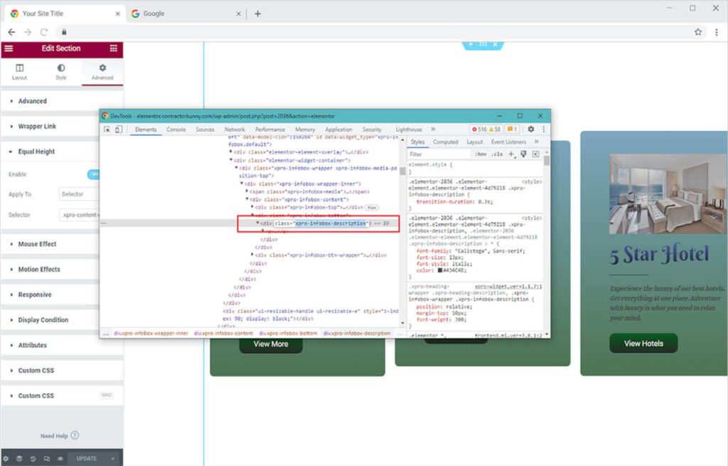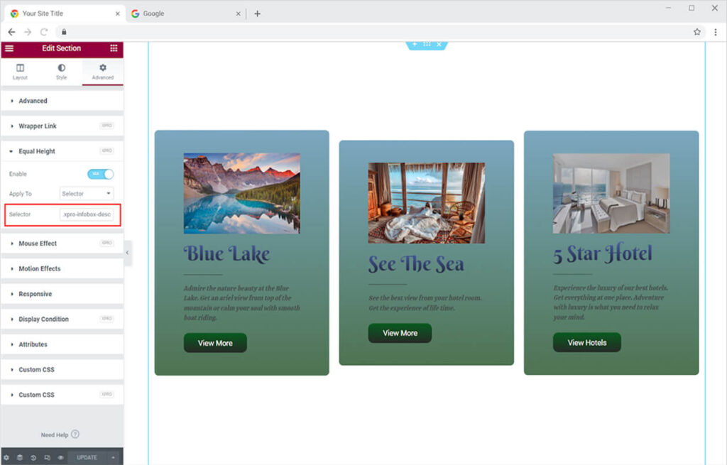 The Xpro Elementor Equal Height Extension is a useful feature that allows you to simply modify the column and widget heights on your website and bring them to the same size. Align the height with either a widget or selector option that allows you to make the size equal to a specific CSS class.