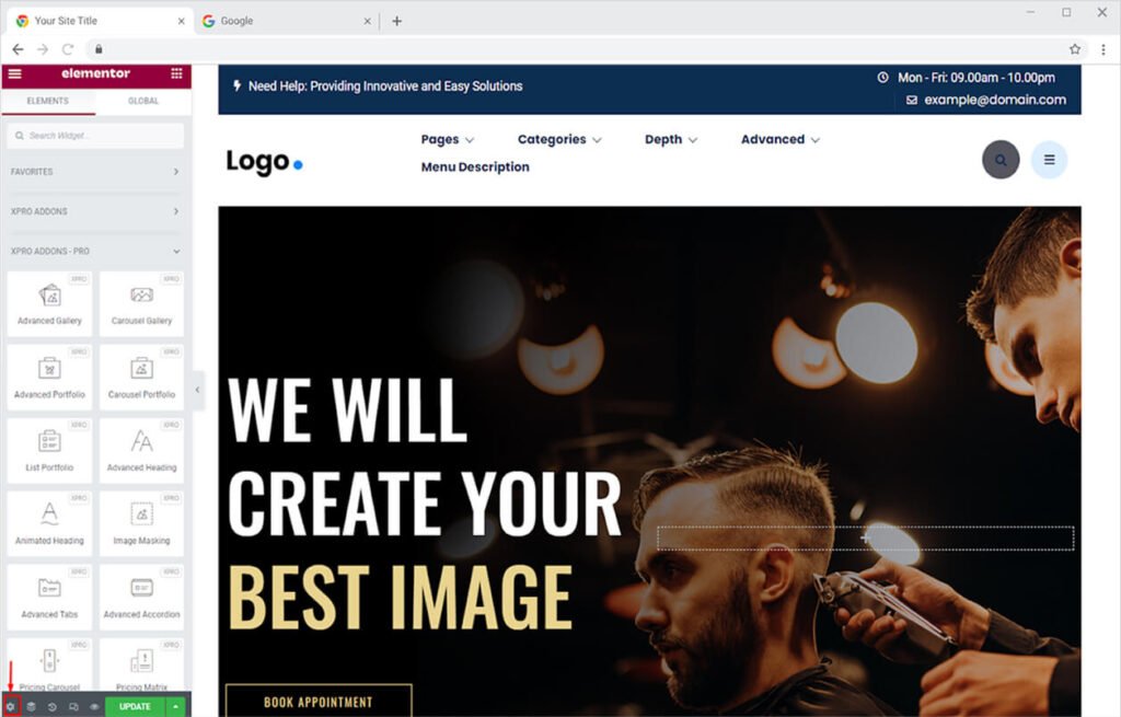 After you make sure that the extension is activated from the WordPress dashboard, open the Elementor Page Builder and click on the settings icon at the bottom left.