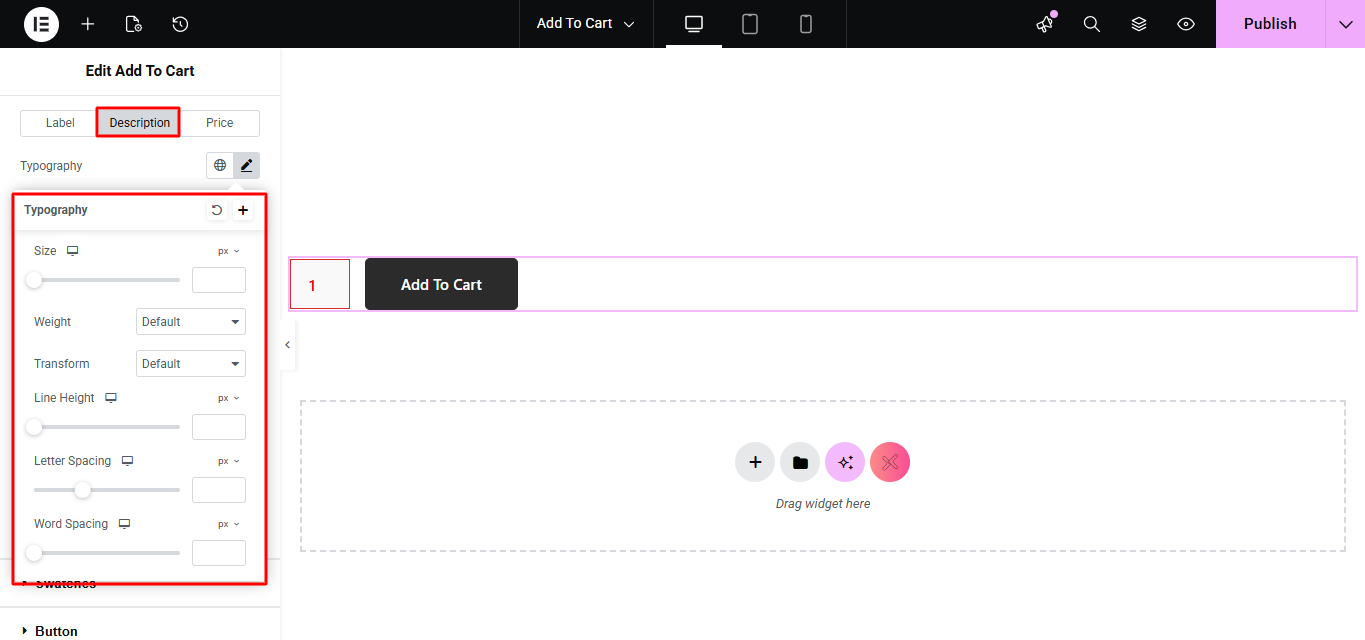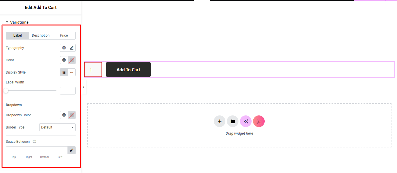 The next menu for variation allows you to customize the product variation display. Personalize the label, description, and price separately. For the label, you can style its typography, color, and display style to inline or block.