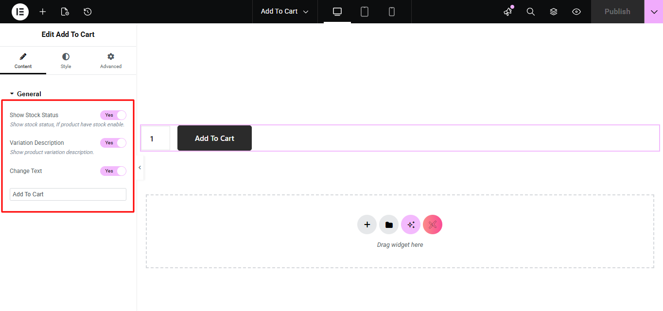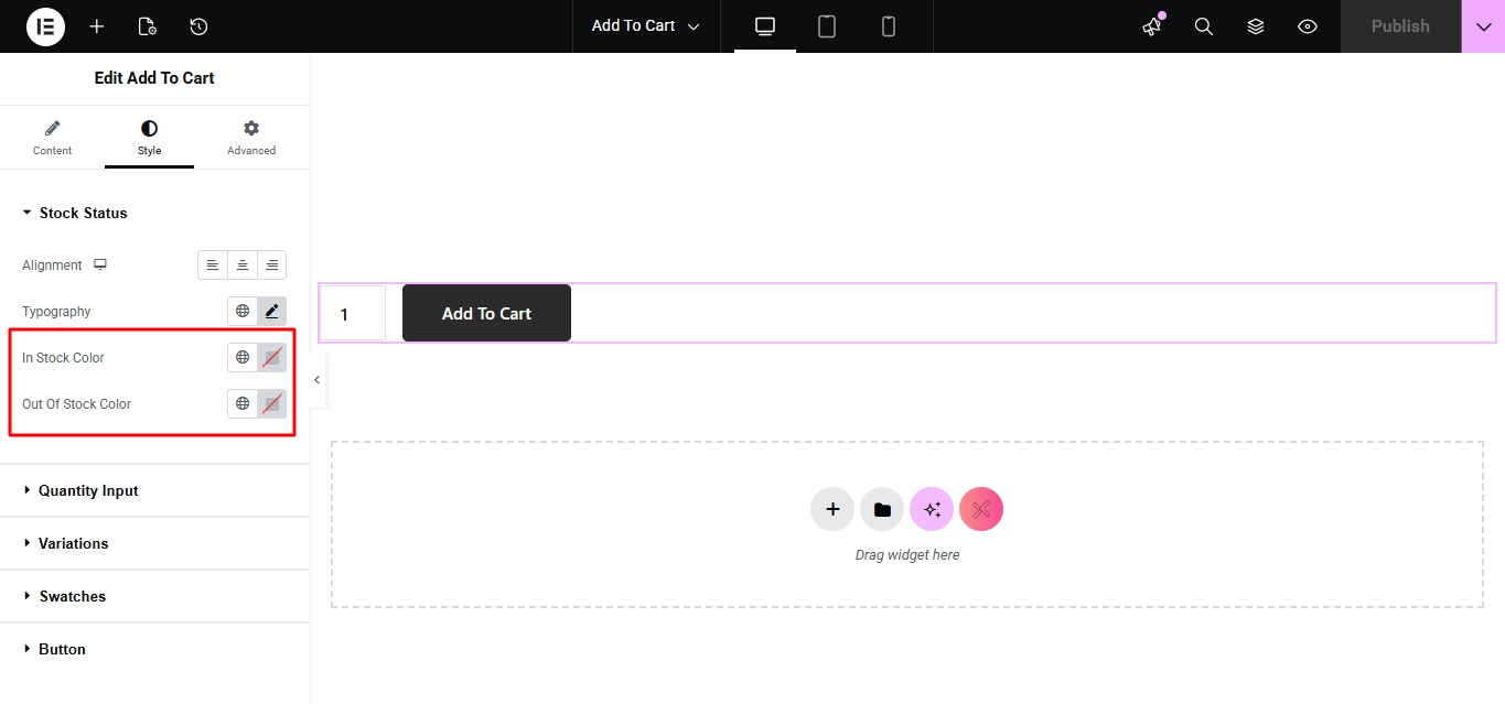 From the Content Section, you have the option to allow the widget to display product variation and stock status. Toggle on and enable the option that you want to display in the product layout.