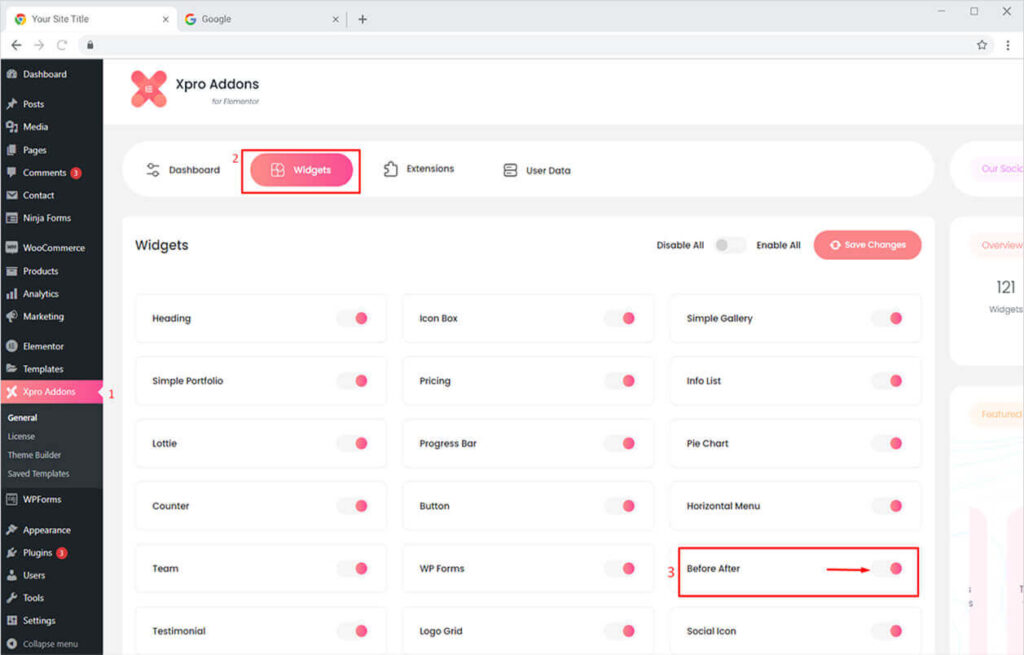 From the Xpro Addons Dashboard, click on the Widgets Tab, find the Before After Widget, and then toggle the button ‘ON’ to enable it.