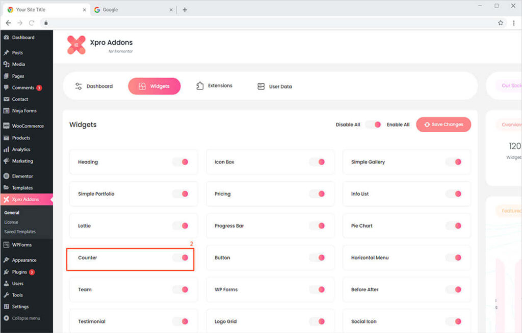 From the Xpro Addons Dashboard, click on the Widgets Tab, find the Counter widget, and finally, toggle the button ON to enable it.