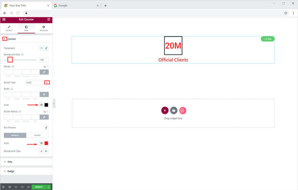 Once you are done adding the content of your Counter. Toggle towards the Style Tab. Start from the Counter Section, here you can change the typography, color, border, background color & size of your counter. Similarly, you can change the color of your Title & Description.