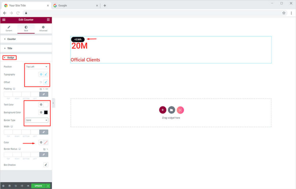 Simply head towards the Badge Section under the Style Tab. Here you can adjust the position, color, typography, and offset. Similarly, you can change the border, background, and colors.