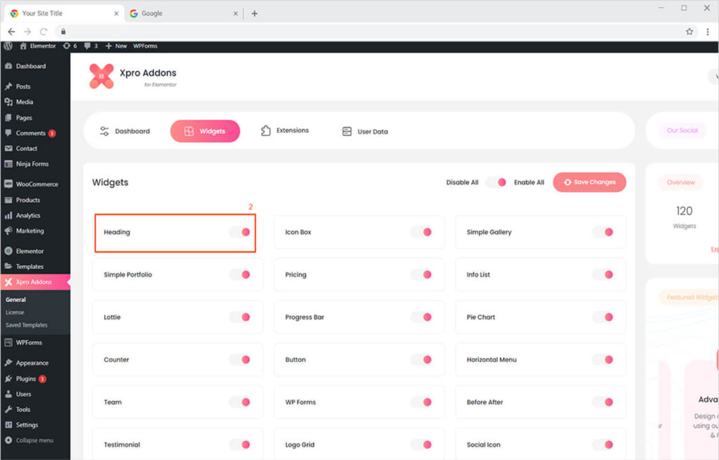 From the Xpro Addons Dashboard, click on the Widgets Tab, find the Heading widget, and finally, toggle the button ON to enable it.