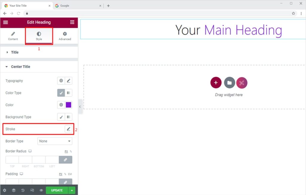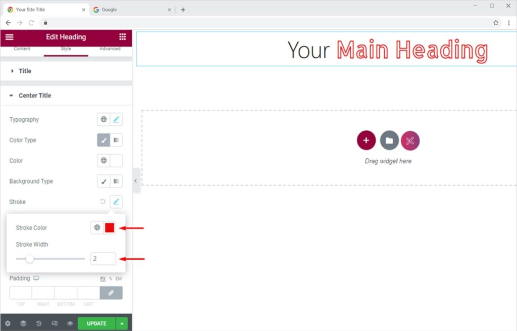 Excite your website visitors by adding a stroke to your headings. Go to the Style section and click on the Stroke option.