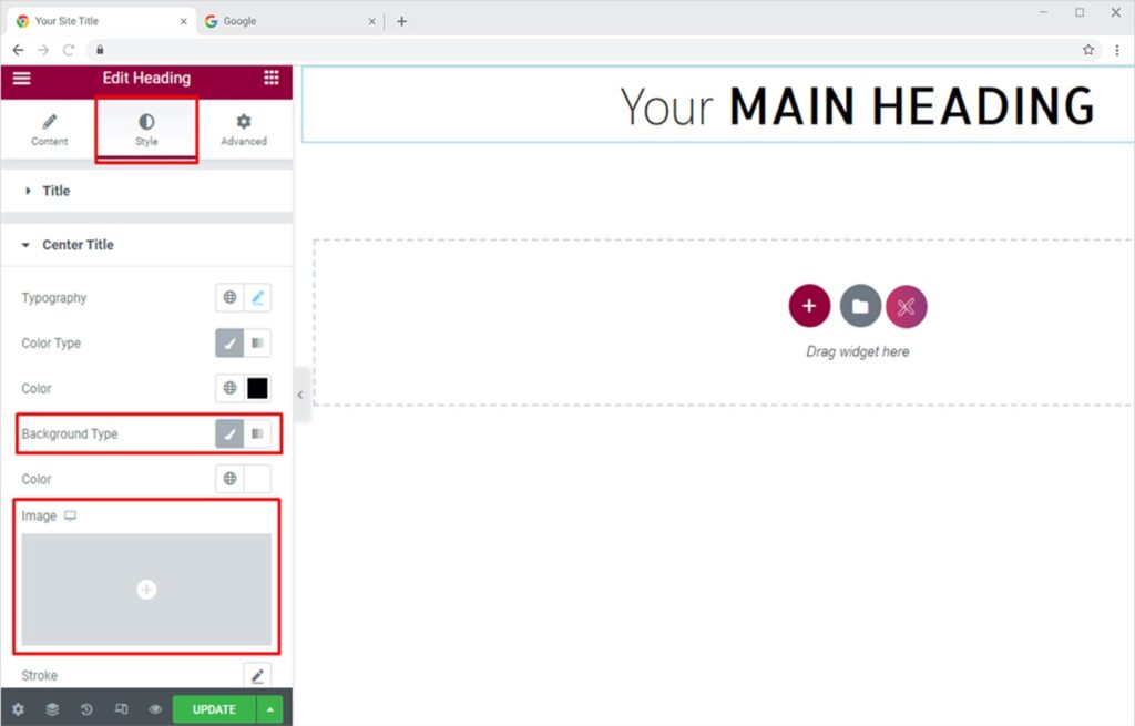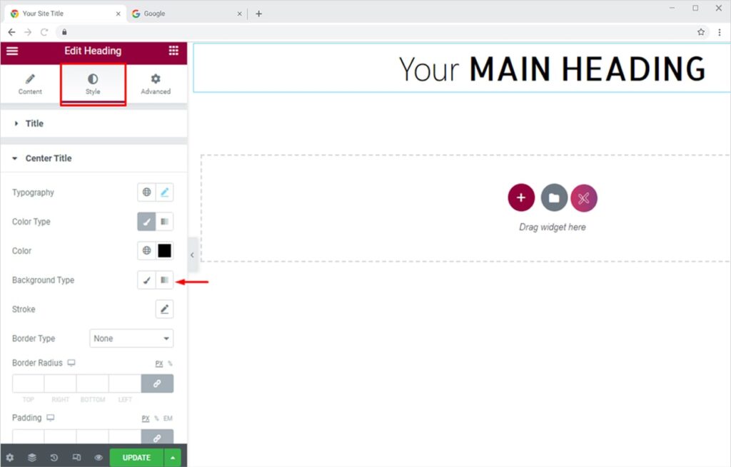 Create pleasant headings with color or gradient set as background. To set color as the background, go to the Style Section and click on the Classic Icon in front of the Background Type option.