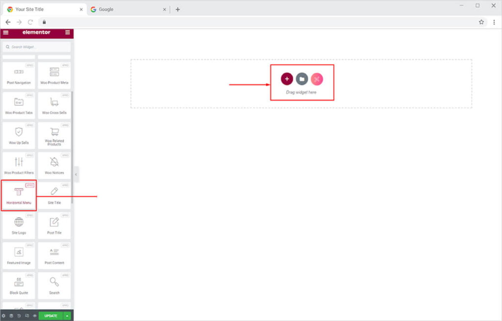 Scroll down the Xpro Addons section, to find the Horizontal Menu Widget. Simply drag’n’drop the widget on the desired page location.