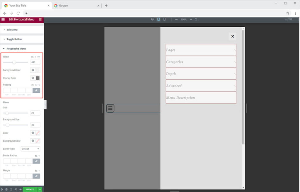 Customize the close icon that appears at the right top of the menu. A user can close the menu by clicking on this icon. Color the icon and background as well as adjust their sizes. Make a border around the icon and adjust its radius, width, and margin. Color the border from the color option.