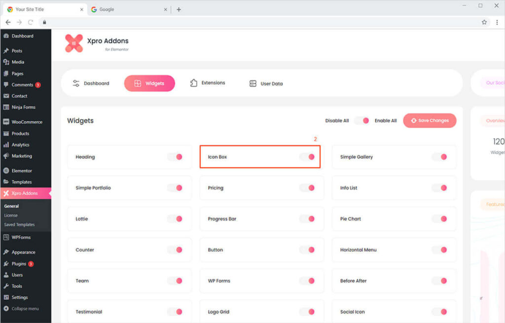 From the Xpro Addons Dashboard, click on the Widgets Tab, find the Icon Box widget, and finally, toggle the button ON to enable it.