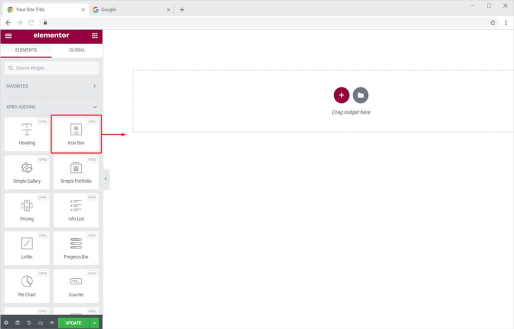 From the Xpro Addons section, simply drag’n’drop the Icon Box widget on your desired page location.