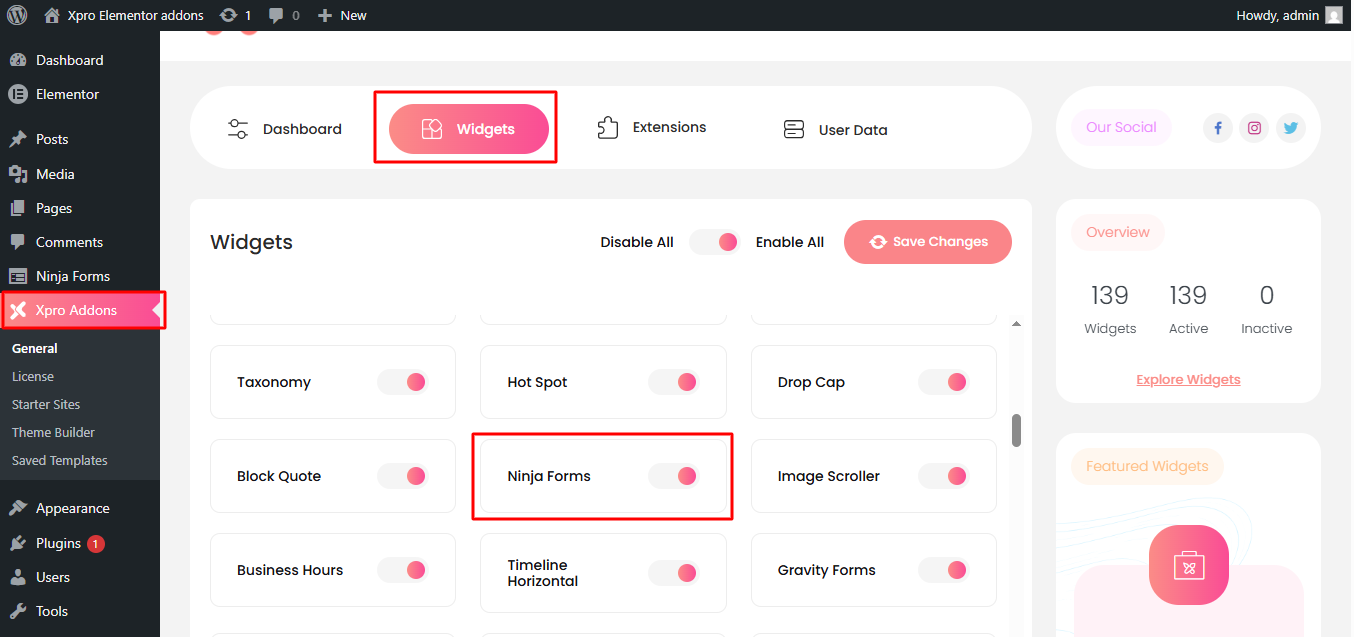 Once you activate, click on the Xpro addon on the left side of the wordpress dashboard and go to the widget section.