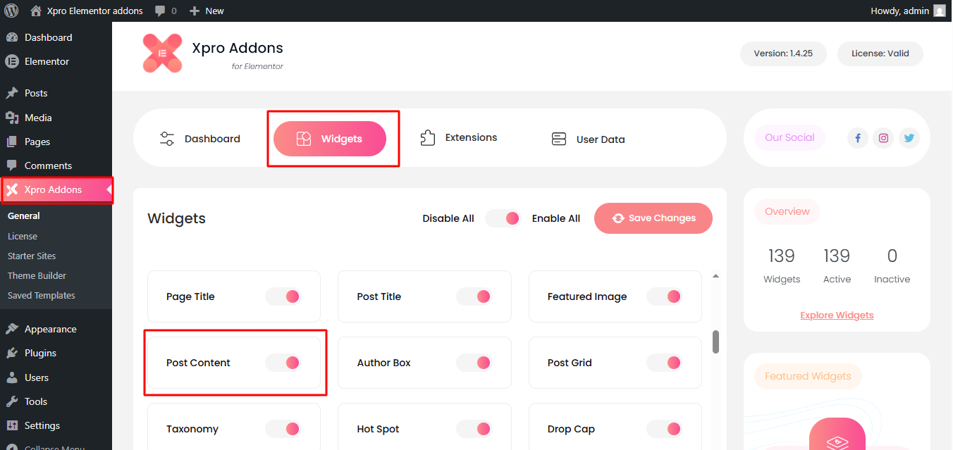 From the Xpro Addons Dashboard, click on the Widgets Tab, find the Post Content widget, and finally, toggle the button ON to enable it.