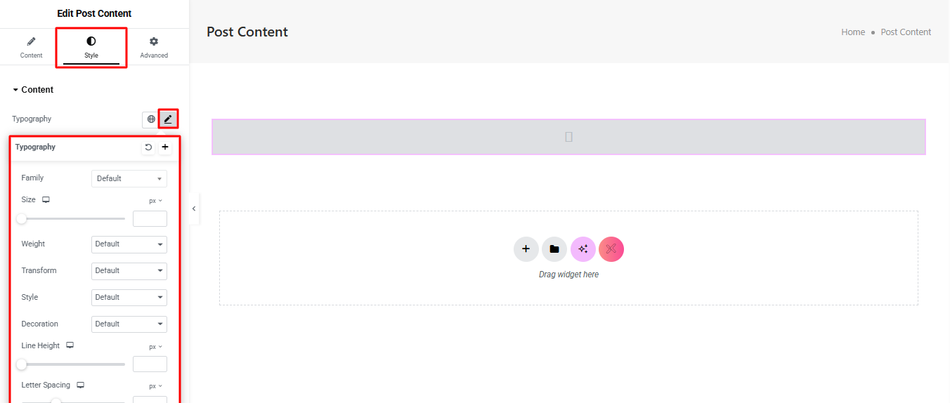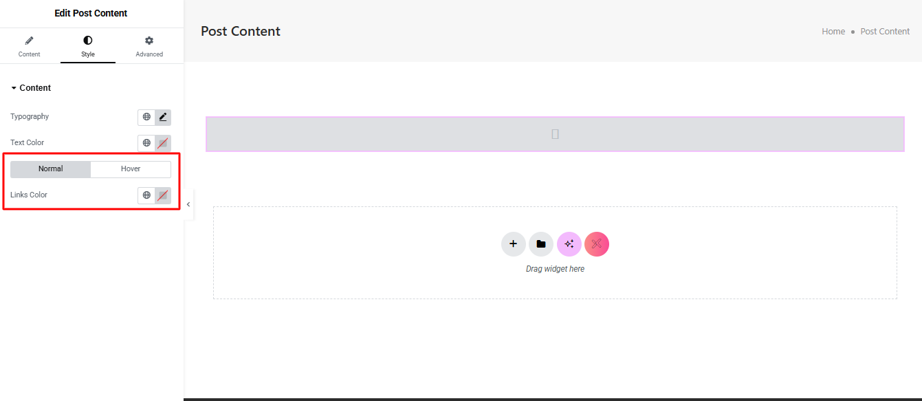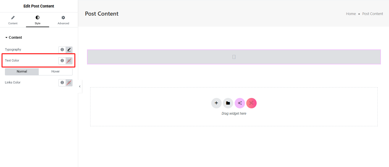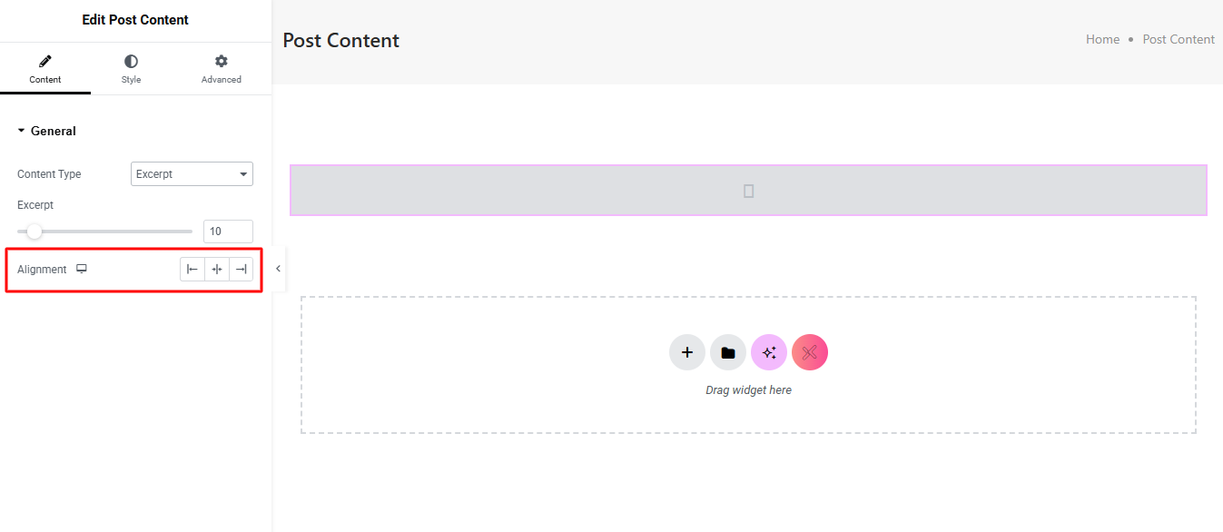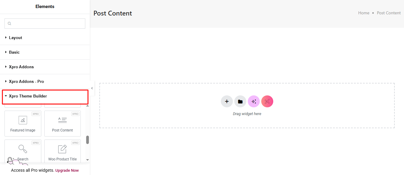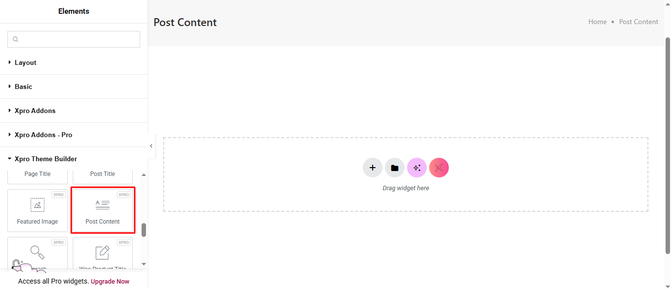 From Xpro Theme Builder, find the Post Content widget and simply drag’n’drop it into the desired location on Elementor Page Builder.