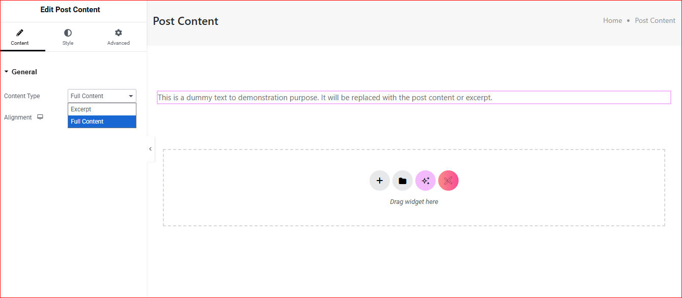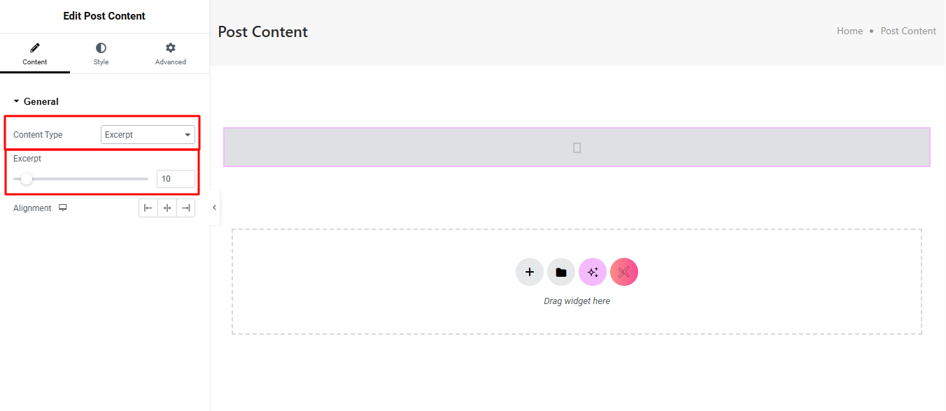 The content section provides you with options to select between two post types; Full Content and excerpt. If you are making a blog post to show all the content then select Full Content and if you want to display a few texts like in loop builder then select excerpt.