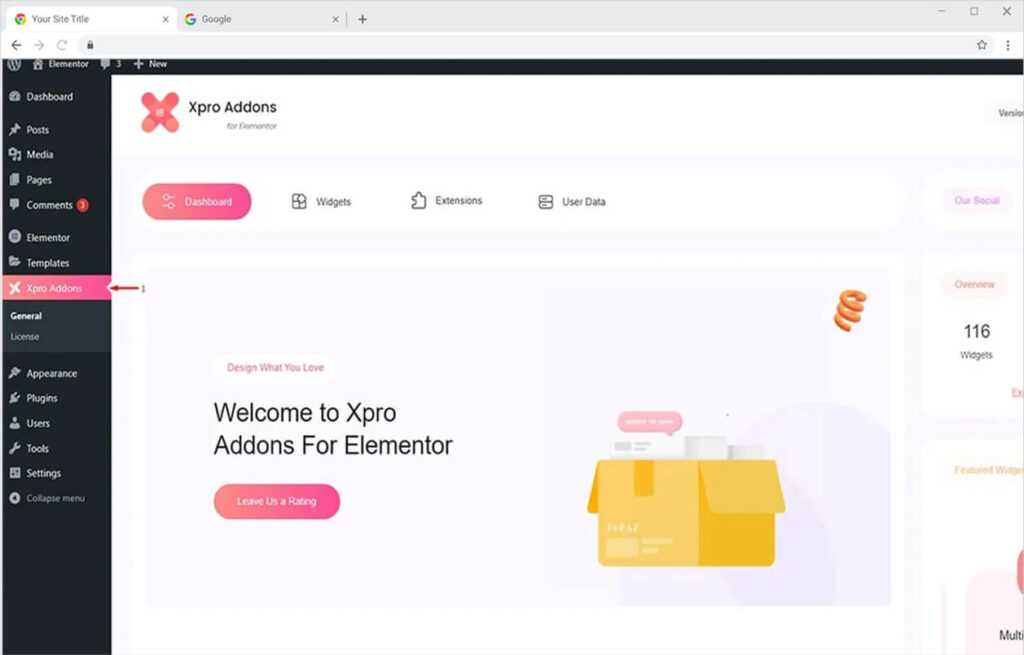 Click on the Xpro Addons option available in the WordPress dashboard menu.