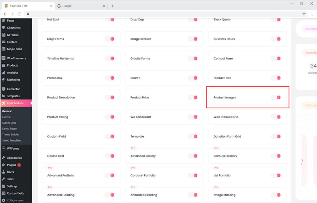 From the Xpro Addons Dashboard, click on the Widgets Tab, find the Woo Product Image widget, and finally, toggle the button ON to enable it.