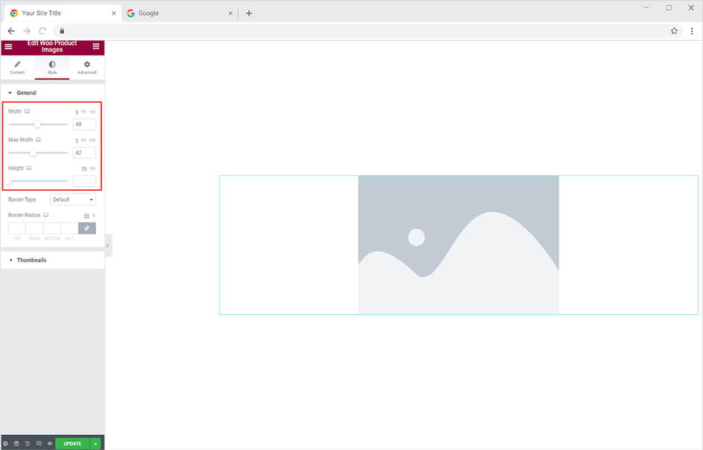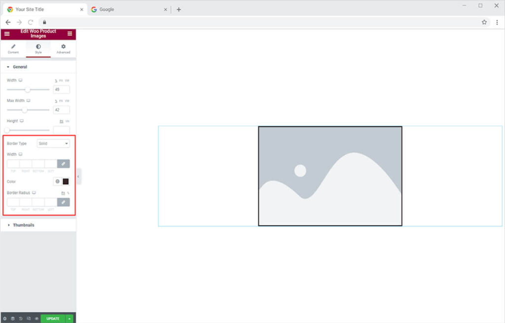 Use the same customization option for the product gallery that you used for the product image. Change the width, max width, and height. In addition, make a border and adjust its width and radius.