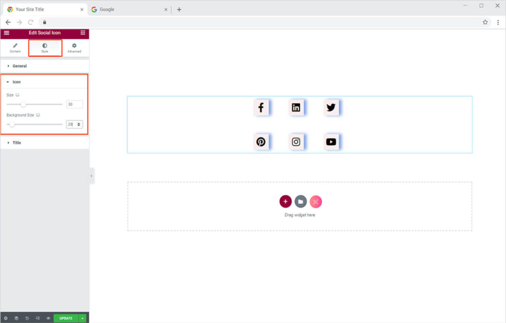 Just quickly heads towards the Icon Section under the Style Tab for a while. Here you can easily adjust the size of the icon and its background to make it more attractive for the users.