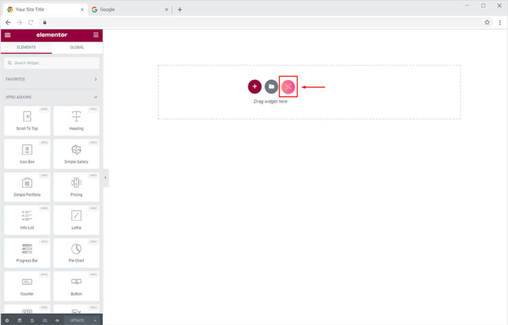 Create a new page or edit an existing one with Elementor in order to insert Xpro templates. Click on the Xpro icon.
