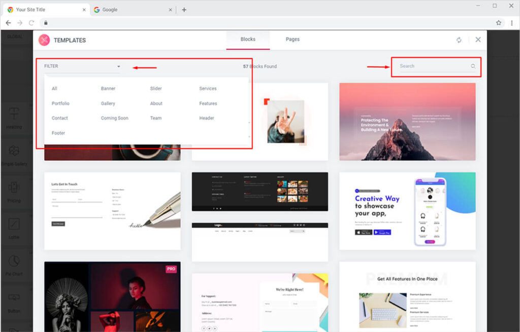 Use the Blocks section when you’re looking for specific design templates like slider, team section, header, and footer. You can easily filter Blocks by categories from the “Filter” option or directly type and search for the template using the “Search Bar”.