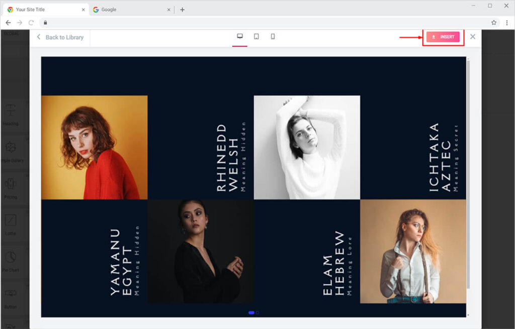 This feature easily gives you an idea about the look of your template on different display devices. Once you are satisfied with the template, click on the Insert button to insert it on your page.